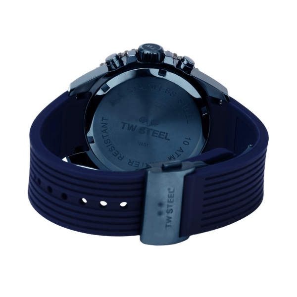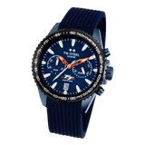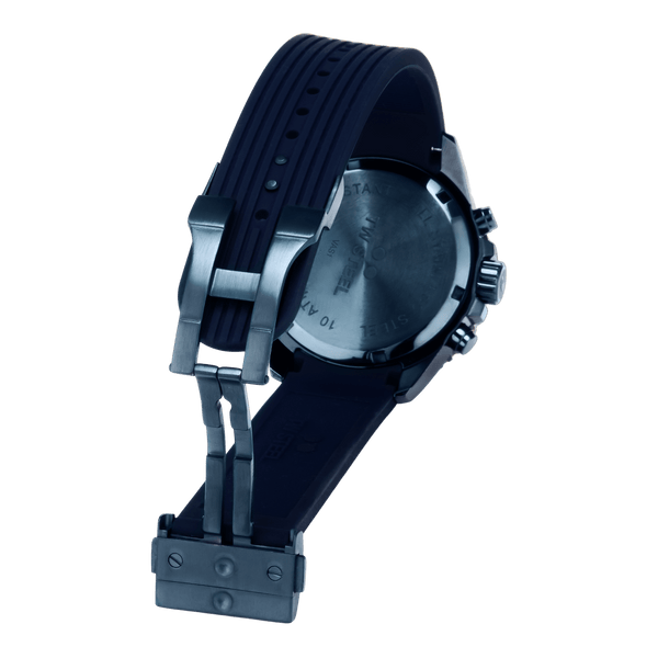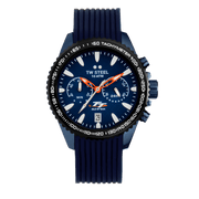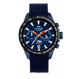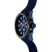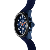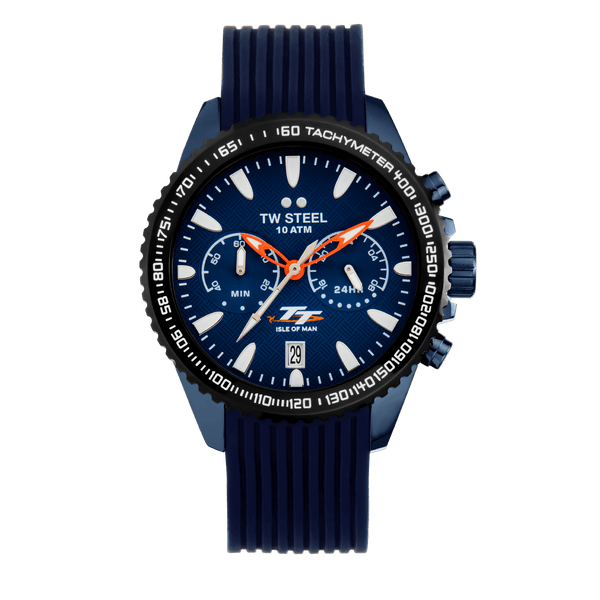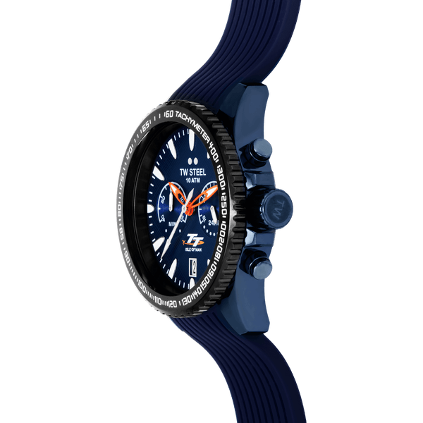 Präzision in Bewegung. Die offizielle TT Isle of Man Edition kommt in einem 42mm blauen Gehäuse mit schwarzer Tachymeter-Lünette, leuchtenden Zeigern und einem blauen Silikonarmband mit Faltschließe.